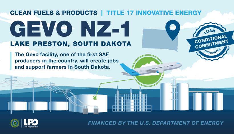 boost to Colorado-based company Gevo to help build a large-scale corn starch-to-jet fuel facility in Lake Preston, South Dakota. The facility will use local low-carbon field corn to produce sustainable biofuels, including SAF. Additionally, the facility will be integrated to use carbon capture and sequestration technology and renewable energy to keep its emissions low. Once completed, the Gevo facility will contribute 60 million gallons of SAF.