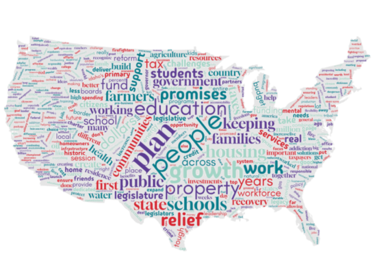 The "word cloud" above was created using the topics frequently mentioned by the Governors in their State of the State addresses.