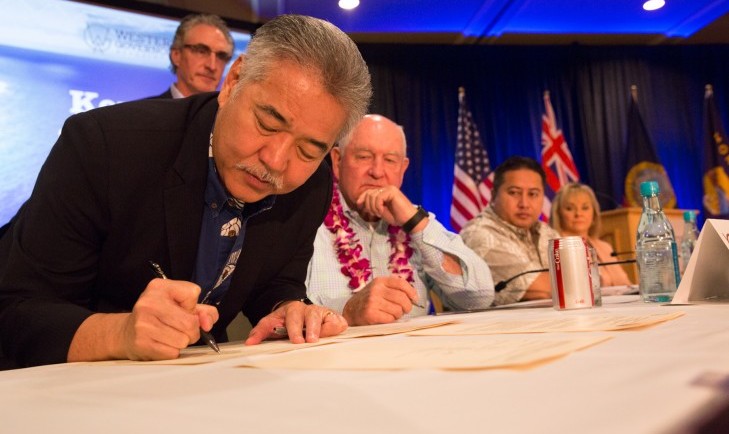 Hawaii Gov. David Ige signs the MOU, as Secretary of Agriculture Sonny Perdue and WGA Vice Chair Doug Burgum look on.